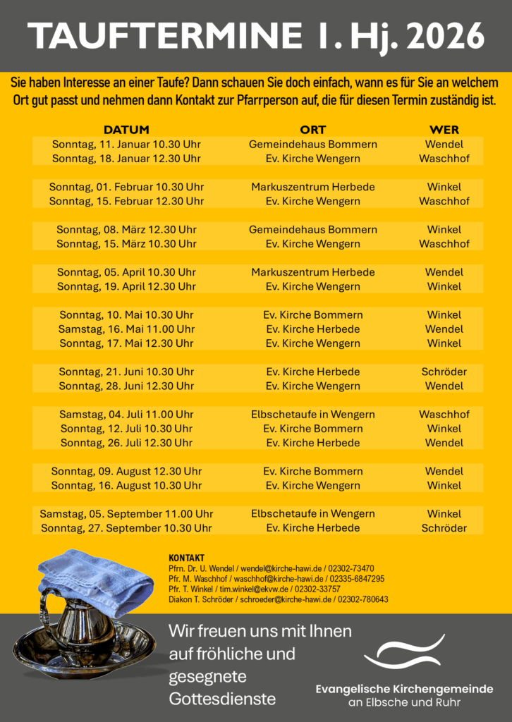 Im persönlichen Gespräch klären wir die nötigen Formalitäten, lernen einander kennen, kommen ins Gespräch über den Taufspruch (oder finden gemeinsam einen), klären Wünsche zur Mitwirkung (wichtig: Niemand wird gezwungen, alle sollen den Gottesdienst genießen dürfen) und beantworten noch offenen Fragen.